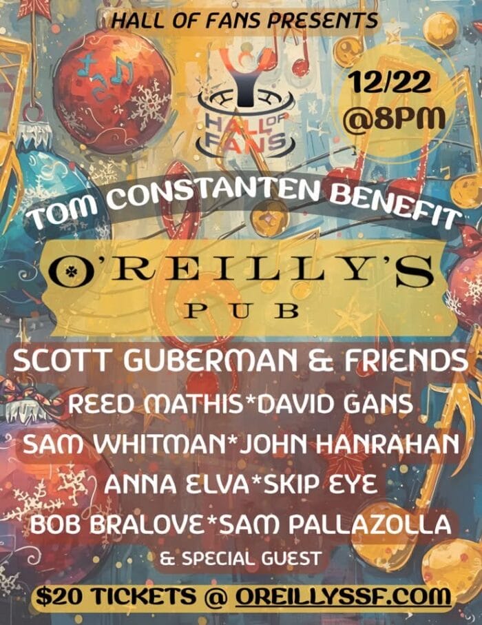 A second benefit has been added on December 22. O’Reilly’s Pub in the Haight-Ashbury section of San Francisco will host the event which will feature music from Scott Guberman & Friends. The confirmed participants include Gans, Mathis, Whitman and Hanrahan. A “surprise guest” will join in the action as well.
