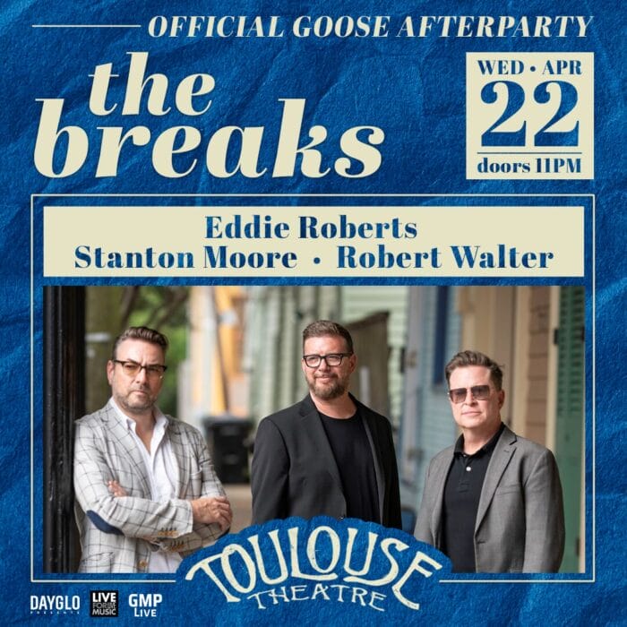 Music will continue after Goose’s Wednesday, April 22, concert when The Breaks–Stanton Moore, Eddie Roberts, and Robert Walter–cement their live sound. The all-star ensemble previously announced the impending release of their debut self-titled album and shared the first single off the record, “Hasheesh.” This show will give fans an early opportunity to unlock the capacity of The Breaks ahead of the record’s official arrival on Friday, May 1st, on the second Friday of Jazz Fest.