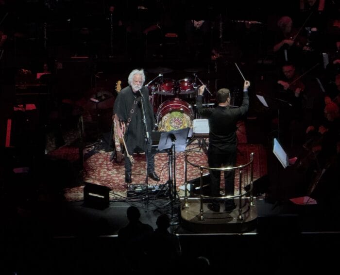 And when “China Cat Sunflower” emerged, with woodwinds handling Weir’s guitar figure, Weir adroitly delivered the tongue-twisting lyrics and the 72 musicians on stage became one under conductor Grzegorz Nowak. This song filled the Albert’s exalted air with electricity before a glorious classical passage marked the transition to “I Know You Rider.”