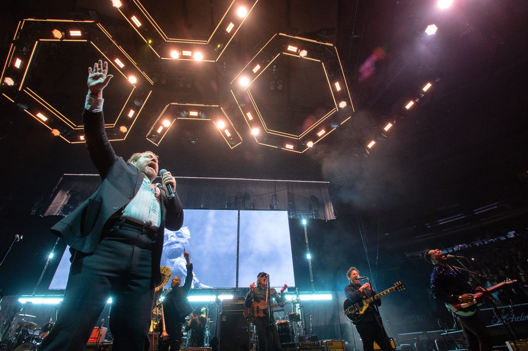 Nathaniel Rateliff & The Night Sweats rallied next, returning to The Garden after rave reviews for its New York stop on the South of Here tour in the spring. The third extended staging of the evening maintained an anthemic, celebratory tone as the ensemble tore through 10 tracks in rapid succession, highlighting such beloved gems from their catalog as “Look It Here,” “Heartless,” “I’ll Be Damned” and “Love Don’t.” A true highlight from the evening arrived at the set’s midpoint, when the legendary vocalist and activist Mavis Staples stepped onstage to add her inimitable talents to Pops Staples’ classic “Friendship,” when she wasn’t bantering with Rateliff. The set’s relative lack of features was more than made up for by the massive group behind the set-closing “S.O.B.,” which saw sit-ins from Randolph, Trombone Shorty and Preservation Hall Jazz Band’s Ben Jaffe.