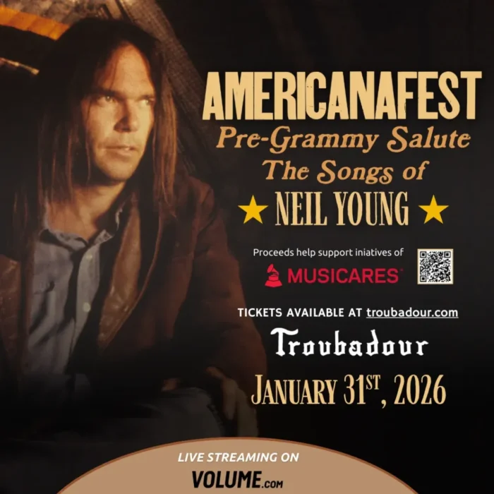 Neil Young’s unparalleled catalog of original music will receive a lift from fellow musicians during this year’s imminent Americana Pre-Grammy Salute, benefiting MusicCares. This year’s gathering will arrive midweek, on Wednesday, Jan. 31, the evening before Music’s Biggest Night, at West Hollywood’s renowned Troubadour venue.