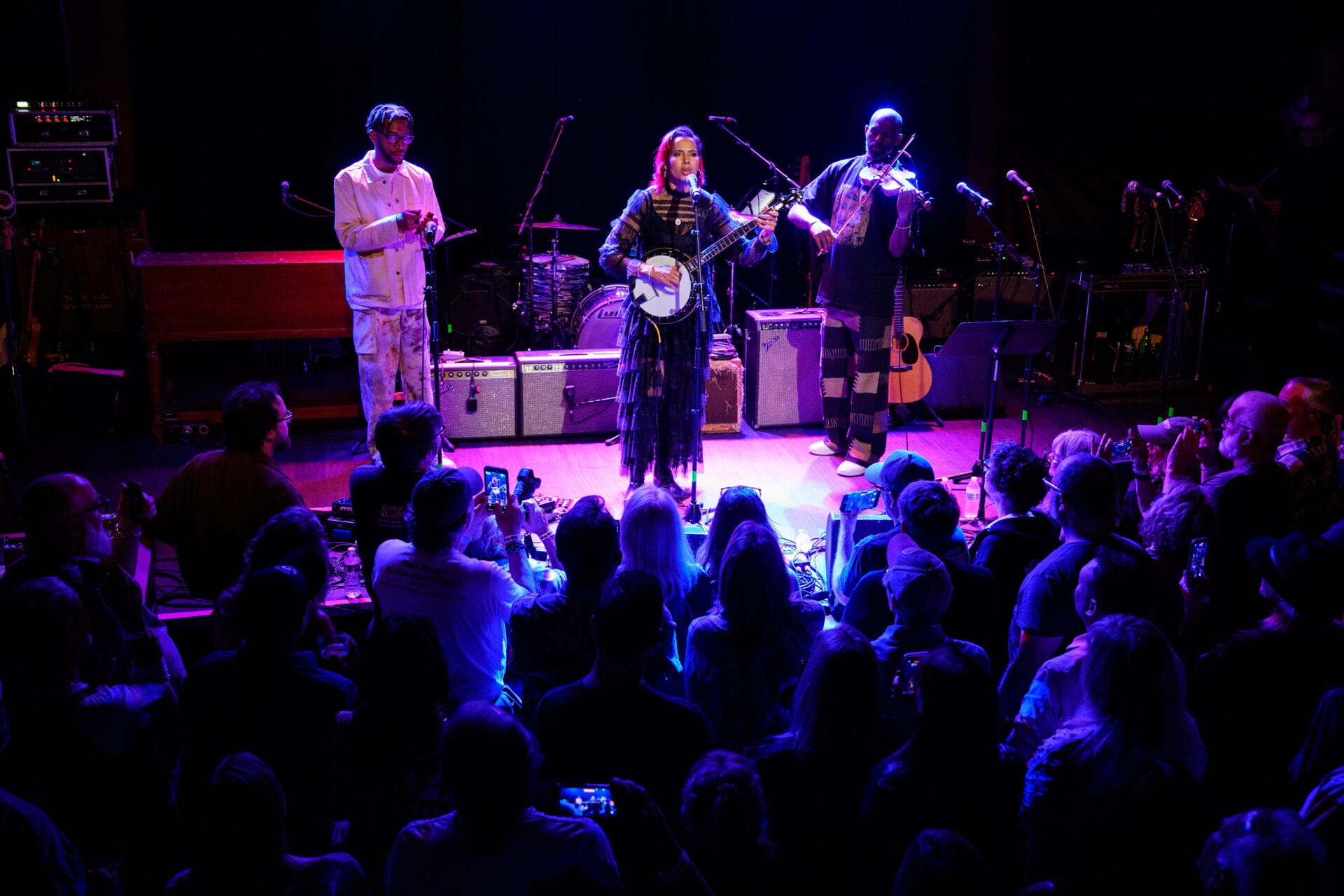 The expansive program began with an introduction to the stacked house band, featuring fiddler and vocalist Sara Watkins, keyboardist Philip Kronengold, guitarist Jim Oblon, bassist Daniel Rhine, drummer Mark Stepro and vocalist Molly Jenson, who set opened with 1972 Harvest essential “Are You Ready for the Country.” The backing sextet was quickly joined by Evangeline for “Field Of Opportunity” and Alex Amen and Hayley Davis for “On the Way Home” before storied folk firebrand Rhiannon Giddens stepped up, alongside her What Did the Blackbird Say to the Crow collaborators Justin Harrington and Justin Robinson, for the classic “Comes a Time.”