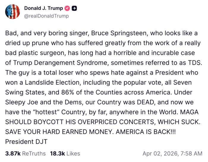 “Bad, and very boring singer, Bruce Springsteen, who looks like a dried up prune who has suffered greatly from the work of a really bad plastic surgeon, has long had a horrible and incurable case of Trump Derangement Syndrome, sometimes referred to as TDS,” Trump wrote on social media. “The guy is a total loser who spews hate against a President who won a Landslide Election, including the popular vote, all Seven Swing States, and 86% of the Counties across America. Under Sleepy Joe and the Dems, our Country was DEAD, and now we have the ‘hottest’ Country, by far, anywhere in the World. MAGA SHOULD BOYCOTT HIS OVERPRICED CONCERTS, WHICH SUCK. SAVE YOUR HARD EARNED MONEY. AMERICA IS BACK!!!”