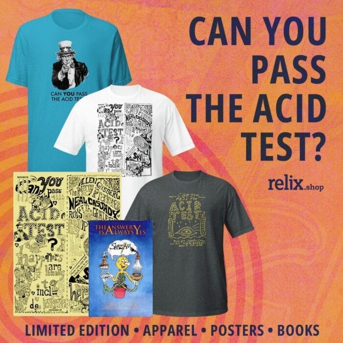 Explore apparel, posters, and books inspired by the Merry Pranksters’ psychedelic art. Limited designs celebrating Kesey, Cassady & the Acid Tests.