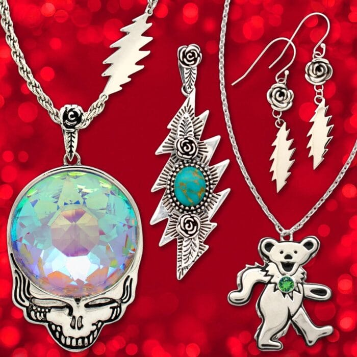 Gifts for Deadheads! Jewelry pieces featuring the iconic Grateful Dead steal your face, dancing bears, roses and lightning bolts; handcrafted in silver, gold, crystals and gemstones. Shop online and on tour, and visit our showroom in Colorado. Created with love, by designer Sarah Lewis. Use code ‘RELIX’ for 10% off.